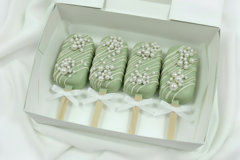 Send some love with our elegant Postal "Sage Green" Cakesicles—a delightful gift wrapped in elegance. Each cakesicle features a tender, flavourful centre encased in creamy green and white chocolate and topped with clusters of edible pearls. Perfect for celebrating birthdays, anniversaries, and life's memorable moments, these handcrafted treats arrive fresh at your door throughout the UK. Spread joy with every bite.